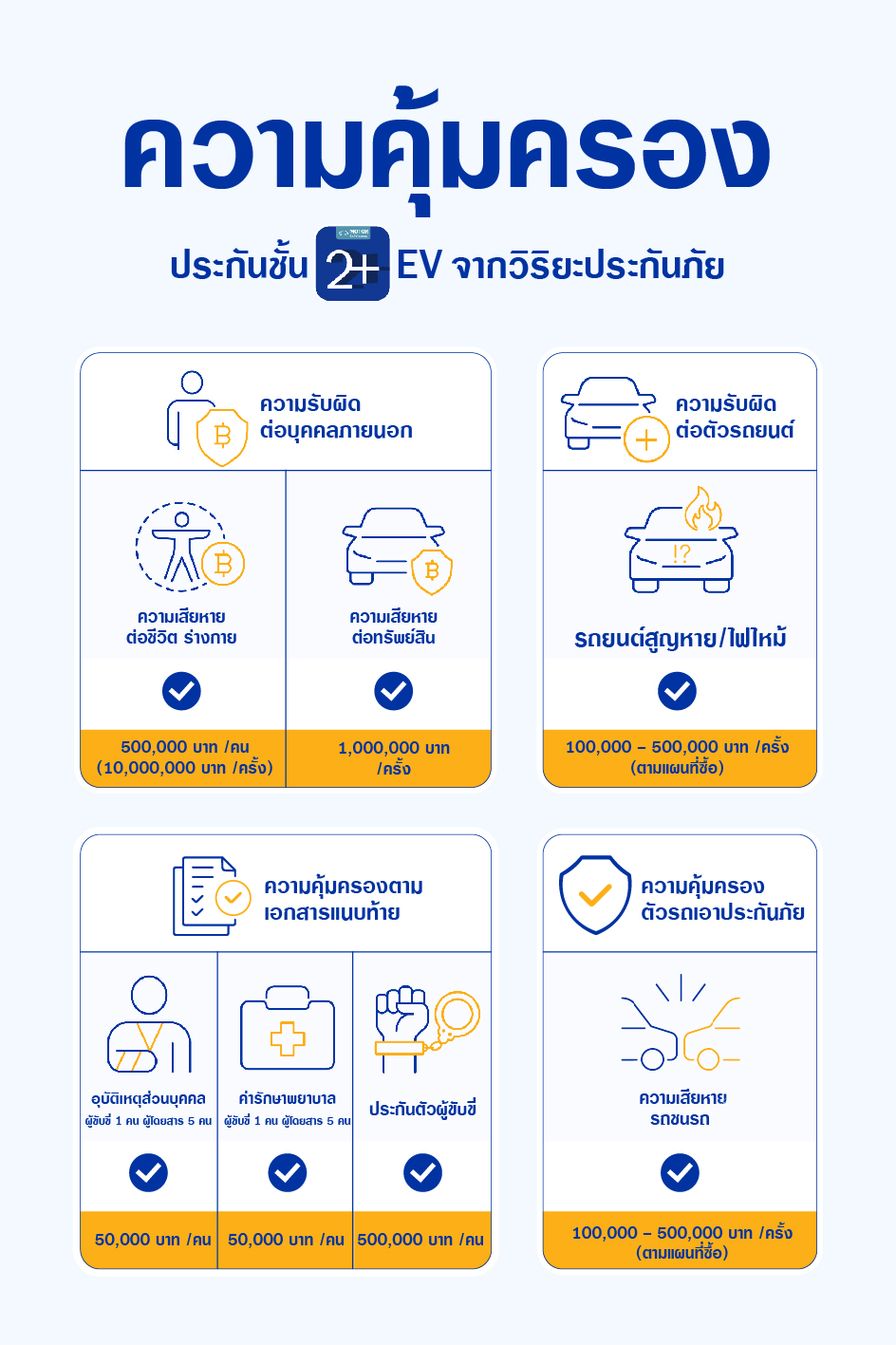 | - ความเสียหายต่อชีวิต ร่างกาย | 500,000 บาท / คน (10,000,000 บาท / ครั้ง) |