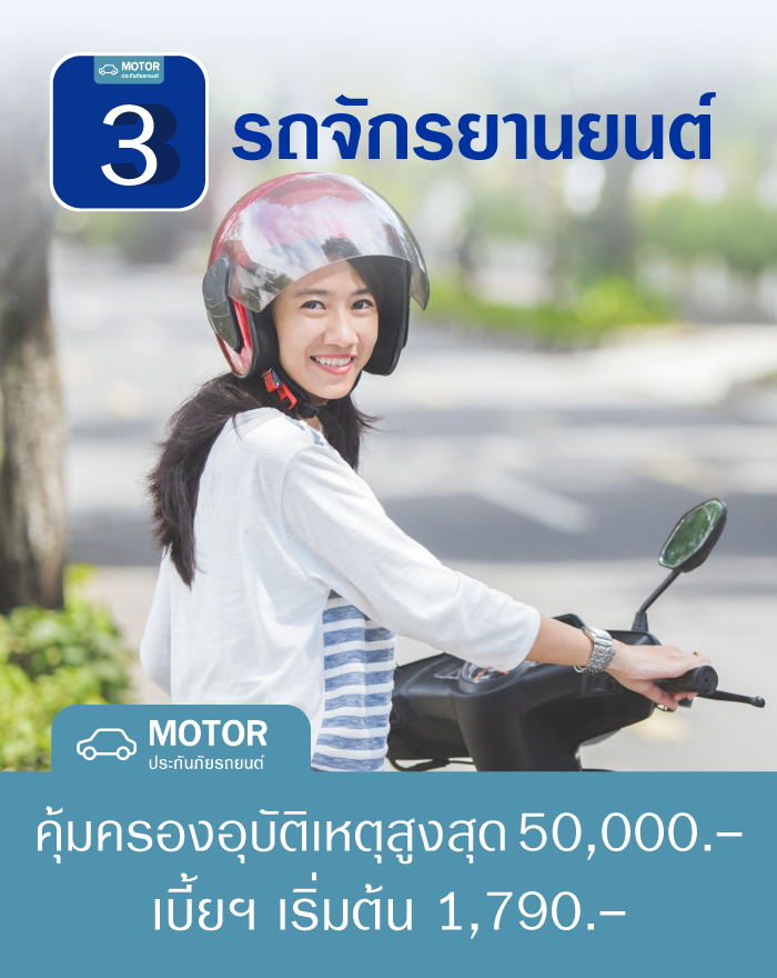 - ประกันภัยรถจักรยานยนต์ชั้น 3 : เหมาะสำหรับผู้ที่มีประสบการณ์การขับขี่สูง, รถจักรยานยนต์ที่มีอายุมาก หรือผู้ที่ต้องการประหยัดเบี้ยประกัน แต่ยังต้องการความอุ่นใจในการรับผิดชอบต่อคู่กรณีเมื่อเกิดอุบัติเหตุ